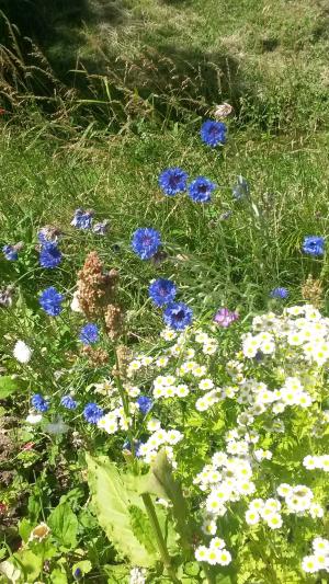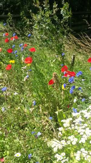 The dense grass growth was cut down in places to allow space for wild flowers to grow. In 2017 over forty species were counted. They include primroses, bluebells, poppies, arum lilies, cornflowers, corn marigolds and oxe-eye daisies. Some less common plants include viper’s bugloss, corn-cockle, and valerian. A few non-native plants have appeared and been allowed to grow e.g. buddleias which are very attractive to bees and butterflies.