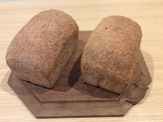The pictures show two loaves made from 100% of the new Pakenham wholemeal spelt flour, and one loaf cut open to show the crumb.