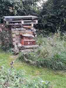 There are dense brush areas and swathes of long grasses. Access to the different areas is by mown paths. There is a ‘wildlife hotel’ which has been converted from a brick barbeque. It has many levels and a wide choice of habitats. Small sheets of corrugated iron have been placed around the site. These warm up in the morning sun and are a haven for voles, slow worms, toads and numerous insects. The sheets can be lifted carefully to observe the ‘residents’.